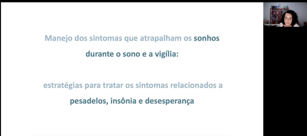 Acesso à aula “Pesadelos e insônia e seus impactos na revivênvia, na desesperança e no risco de suicídio em casos de trauma: como manejar sintomas que atrapalham os sonhos, literal e simbolicamente, no sono e na vigília”.
